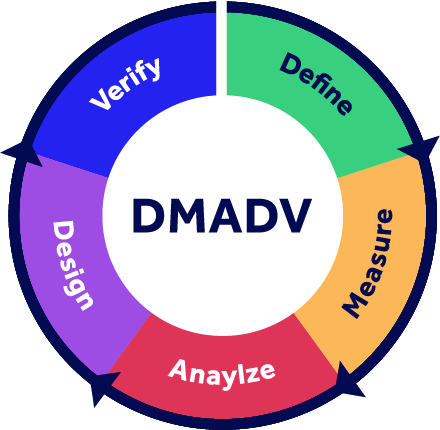DfSS ist für Re- und Neu-Designs einsetzbar und folgt hierbei einem schrittweisen Vorgehen, dem sog. DMADV-Phasenmodell. Es steht für Define, Measure, Analyze, Design, Verify und sorgt für einen klaren und reproduzierbaren roten Faden in der Projektarbeit und stellt damit einen effizienten Ressourceneinsatz sicher. Es nimmt Projektteams „an die Hand“ und sorgt dafür, dass sich Teams nicht in Fehlentwicklungsrisiken verlieren. Auch agile Denk- und Arbeitsweisen können in die einzelnen Phasen des Vorgehens integriert werden, um bspw. schnell und mit direktem Kundenfeedback zu ersten Ergebnissen zu kommen und um auch in der Umsetzung von Innovations- und Entwicklungsvorhaben noch nötige kreative Freiheitsgrade vorhalten zu können.