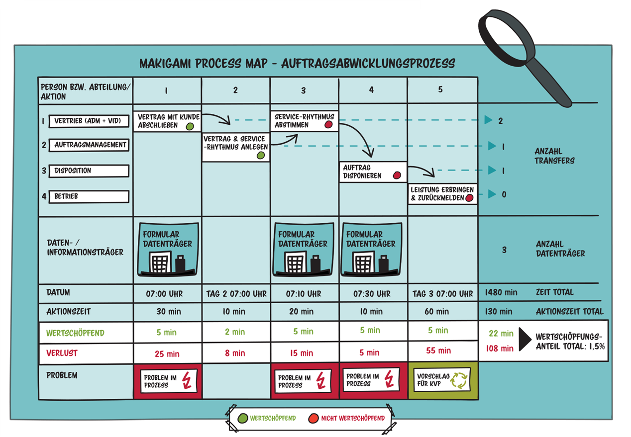 Makigami macht Unternehmensprozesse transparent und ermöglicht es, sie dadurch zu analysieren und zu verbessern. Die Methode deckt nicht-wertschöpfende Aktivitäten sowie deren Ursachen wie Schnittstellen- und Kommunikationsprobleme oder unnötige Prozessschritte und Dokumentationen auf. Sie eignet sich damit vor allem für teambasierte interne Effizienzsteigerung von administrativen Prozessen und Dienstleistungen.